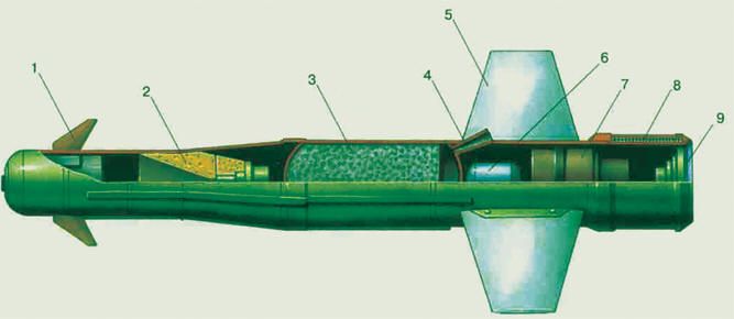 1 — аэродинамические рули;2 — кумулятивная боевая часть;3 — твердотопливный двигатель; 4 — сопло; 5 — крылья;6 — гироскопический блок системы управления;7 — батарея;8 — катушка с проводом;9 — источник излучения